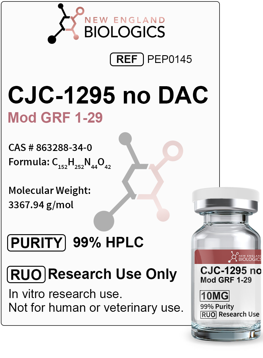 CJC-1295 No DAC, also known as Modified GRF 1-29 or Mod GRF (1-29), is a synthetic analog of growth hormone-releasing hormone (GHRH) consisting of 29 amino acids. This peptide represents the biologically active segment of the naturally occurring 44-amino acid GHRH, with strategic amino acid substitutions at positions 2, 8, 15, and 27 to enhance stability and resistance to enzymatic degradation. Unlike CJC-1295 with DAC (Drug Affinity Complex), the No DAC version maintains a shorter half-life of approximately 30 minutes to several hours, allowing for pulsatile growth hormone release that closely mimics the body's natural secretory patterns.