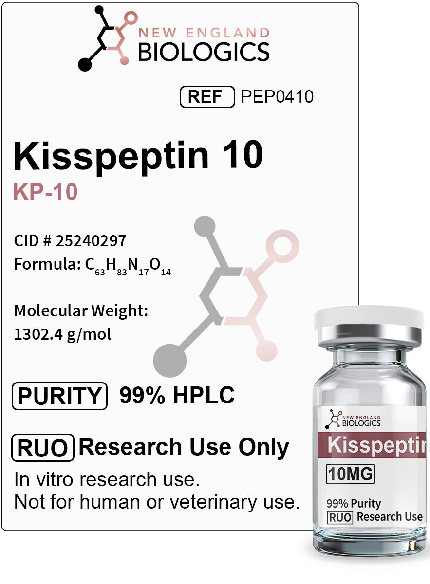 Kisspeptin 10 (also known as metastin or KP-10) is a bioactive peptide consisting of 10 amino acids that represents the core C-terminal sequence shared by all kisspeptin isoforms. Originally discovered for its metastasis-suppressor properties, this peptide has emerged as a fundamental regulator of the hypothalamic-pituitary-gonadal axis and metabolic homeostasis through activation of its G protein-coupled receptor, KISS1R.