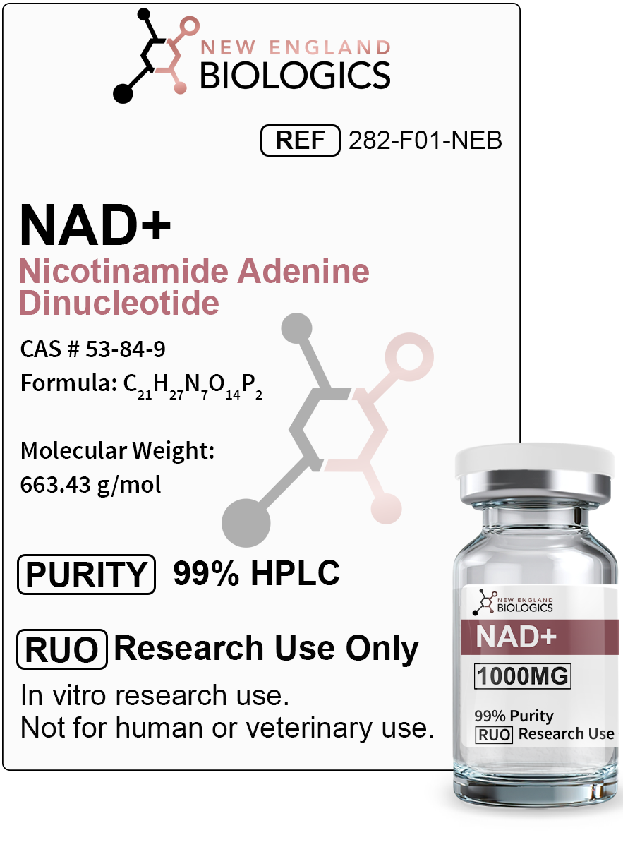Our NAD+ is provided at research-grade purity, suitable for laboratory applications and experimental protocols. Each batch undergoes quality control testing to ensure consistency and reliability for your research needs. Important: This product is intended for research purposes only and is not for human or veterinary use. It is sold for laboratory and scientific investigation only.NAD+ Structure