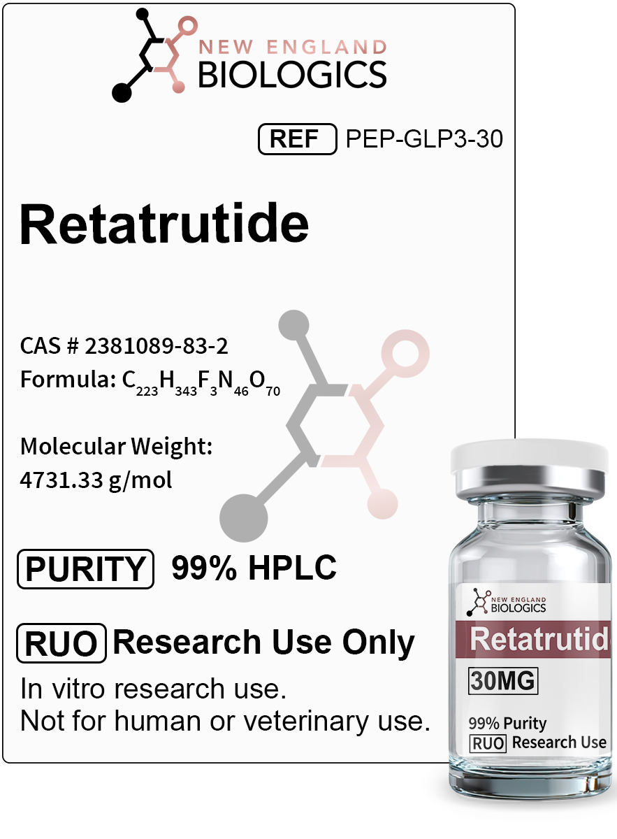 The peptide consists of a 39-amino acid sequence conjugated to a C20 fatty diacid moiety, which provides an extended half-life of approximately 6-8 days, enabling convenient once-weekly subcutaneous administration. Retatrutide demonstrates enhanced potency at the human GIP receptor compared to native GIP, while exhibiting moderate potency at GLP-1 and glucagon receptors. This carefully balanced receptor activation profile optimizes metabolic outcomes while maintaining an acceptable safety profile.
