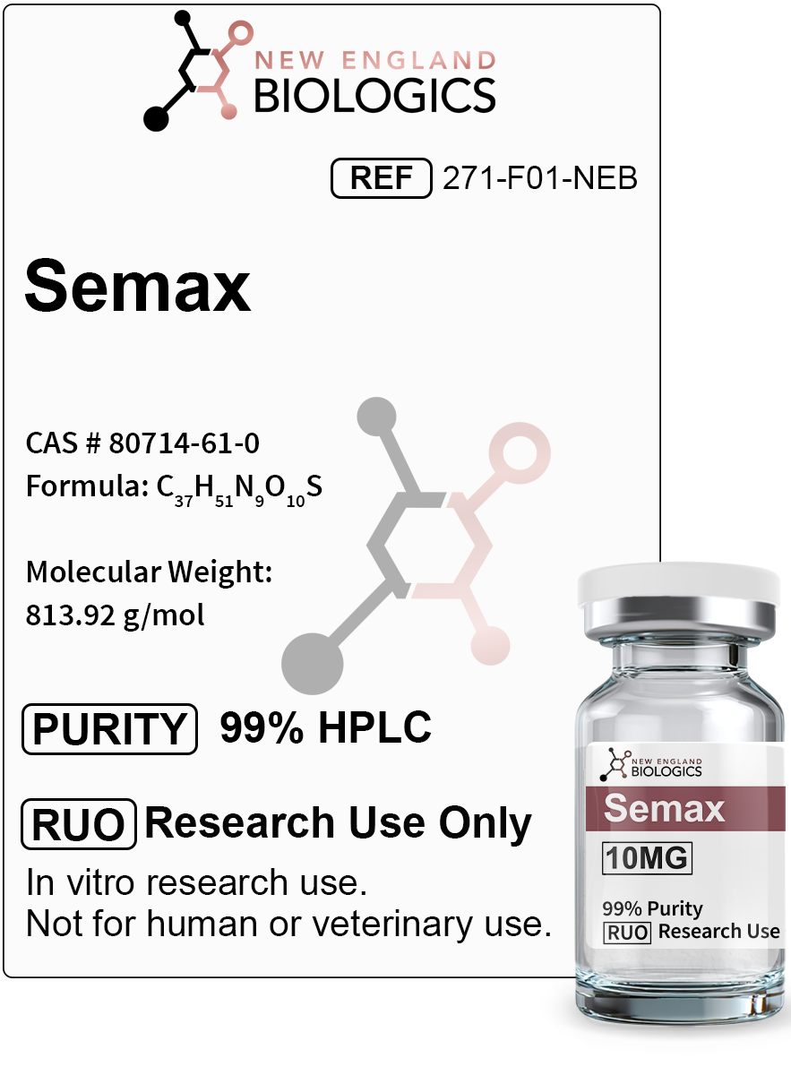 Semax functions as a multifaceted neurotropic agent that crosses the blood-brain barrier, particularly when administered intranasally, allowing direct central nervous system access. The peptide has been approved for clinical use in Russia and is listed on the Russian List of Vital & Essential Drugs for treating ischemic stroke, transient ischemic attacks, memory and cognitive disorders, optic nerve diseases, and immune system support.